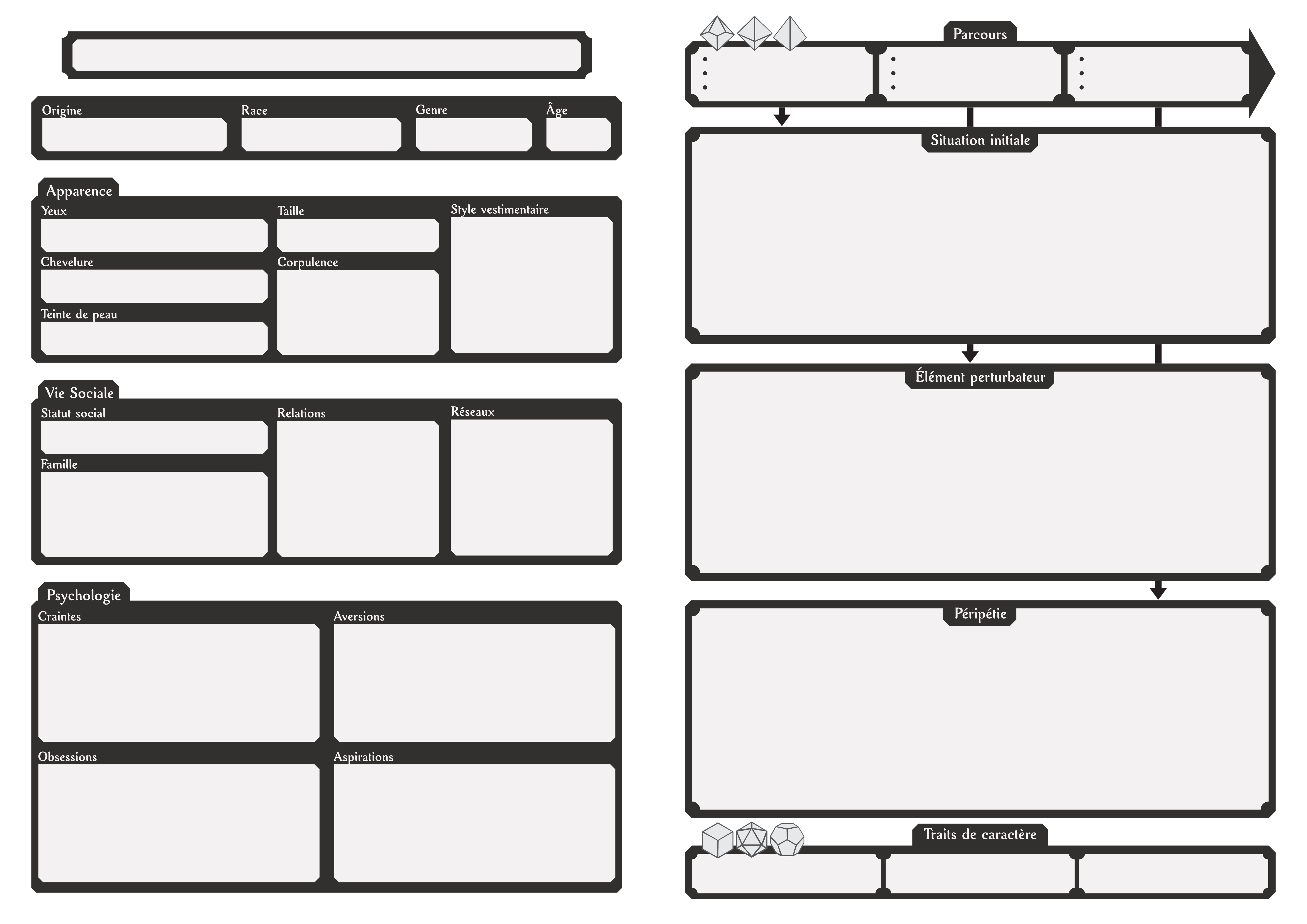 Ces trois cases correspondent aux trois Traits de personnalité que votre personnage à développer au cours des trois événements décrits plus haut : le premier pour la situation initiale, le second pour l’élément perturbateur et le dernier pour la péripétie. Le D6, D20 et le D12 représentés sont les dés à tirer pour pouvoir les définir aléatoirement.