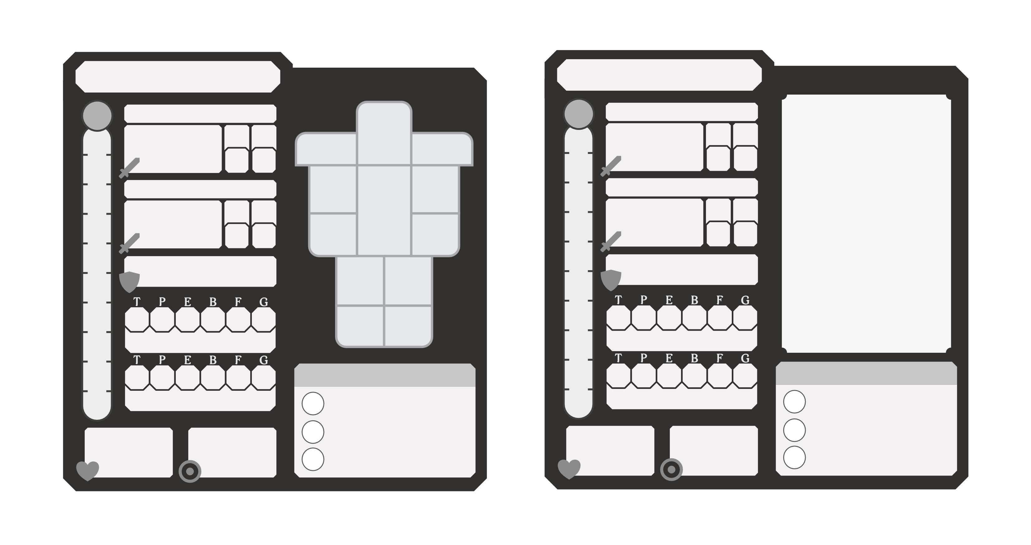 Cette partie représente l’Arsenal des armes dont vous disposez. Vous pourrez utiliser deux sets d’armes à la fois : Principales et Secondaires. Chaque colonne dans ses sets représente votre main dominante et non dominante. Si l’arme s’utilise à deux mains, laissez vide la deuxième colonne. Vous pourrez inscrire toutes les propriétés de votre arme, en particulier les Dégâts qu’elle peut infliger en fonction du Type de Dégâts. T, P et E signifient respectivement Tranchant, Perforant et Écrasant. Les emplacements sans lettre associée laisse une place pour ajouter un Type de Dégâts non compris dans ces trois derniers. L’emplacement en dessous est pour noter la Portée de l’arme, et le suivant est pour l’Atout qu’elle vous confère.