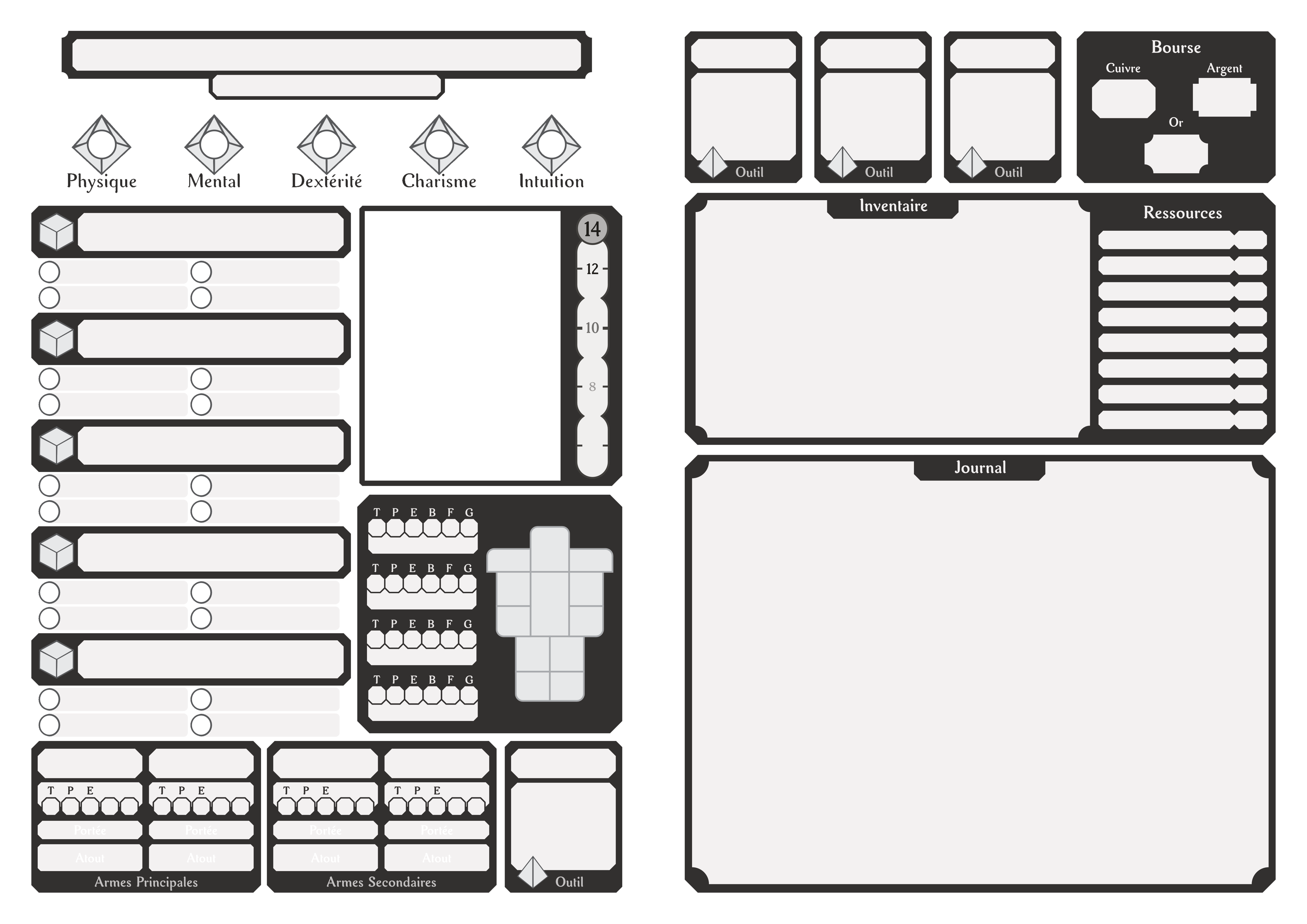 Cette fiche permet de mieux décrire un personnage, sans pour autant donner trop d’information superflues. Il est alors possible de représenter les partie protégées de son corps, ainsi que de lui octroyer une Compétence. Le cadre Compétence peut également être utile pour représenter les pouvoirs d’une créature magique.