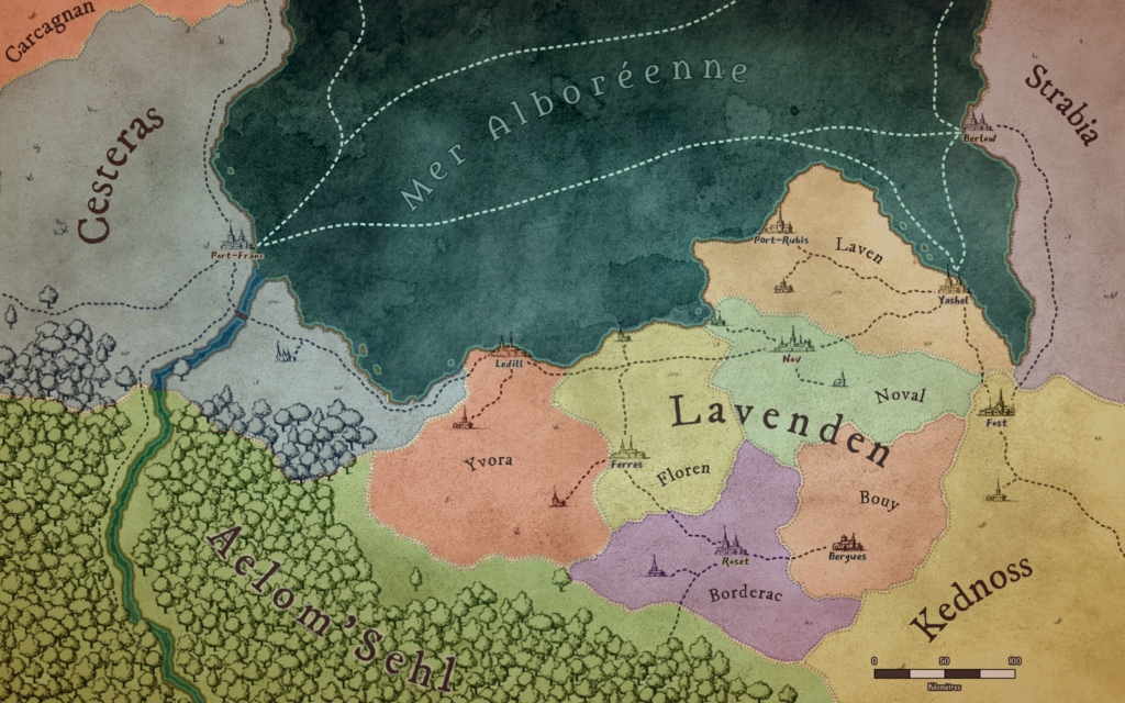 Lavenden, un pays autrefois gouverné par l’illustre famille d’Esbaahl, est divisé en six cantons distincts : Laven, Noval, Floren, Borderac, Yvora et Bouy. Sa riche histoire en fait une nation de première importance parmi les pays du bassin alboréen. Sa capitale, Yasehl, est connue dans tout le continent de Grimm pour son excellence et son innovation dans le domaine des arts.